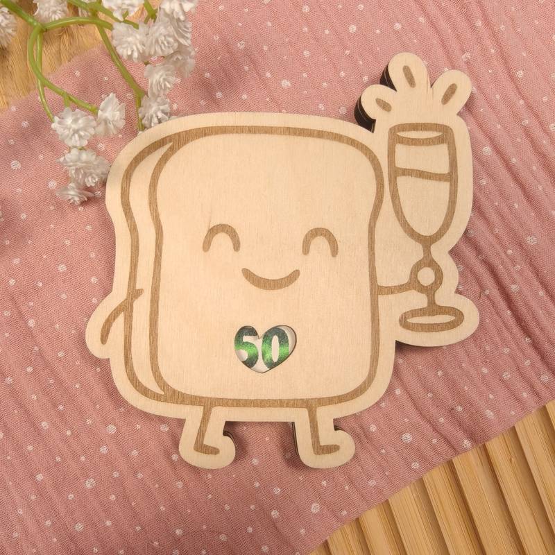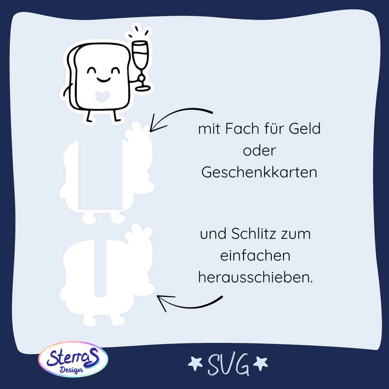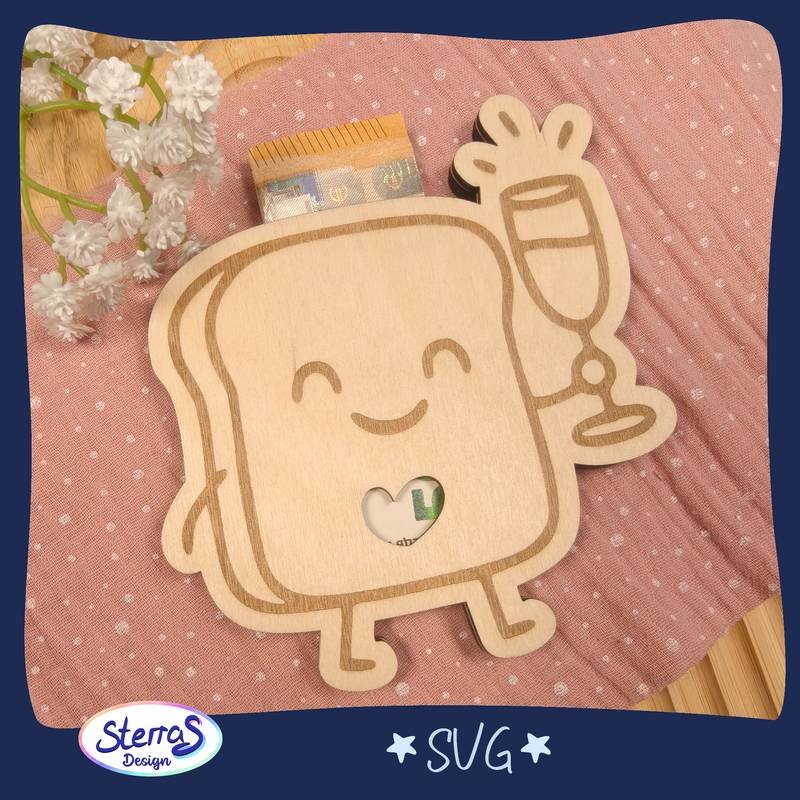Diese digitale Laserdatei zeigt ein liebevoll gestaltetes Motiv: Ein Toast mit Gesicht, Herz und einem Sektglas in der Hand. Das dreischichtige Design eignet sich ideal, um Geschenkkarten oder Geld stilvoll zu verschenken: