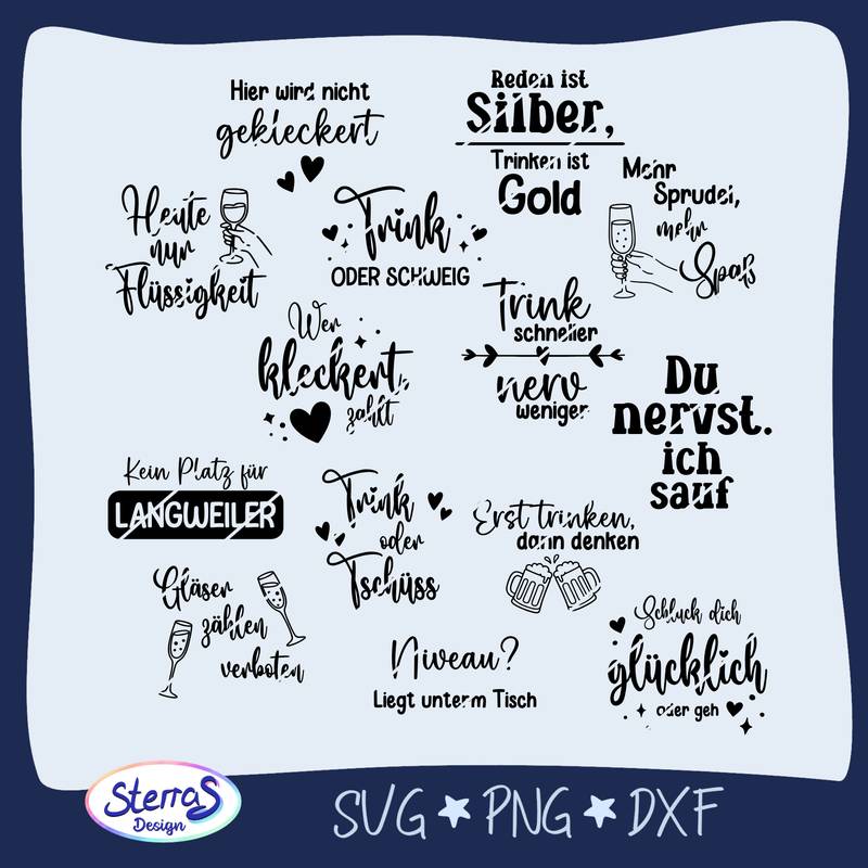 Dieses Set bringt freche, provokante Sprüche auf den Tisch: 14 witzige und selbstbewusste Sprüche wie „Hier wird nicht gekleckert“, „Schluck dich glücklich – oder geh“ oder „Du nervst, ich sauf“ sorgen für Humor, provokanten Charme und gute Laune bei Untersetzern, Tassen, Gläsern oder anderen DIY-Projekten.